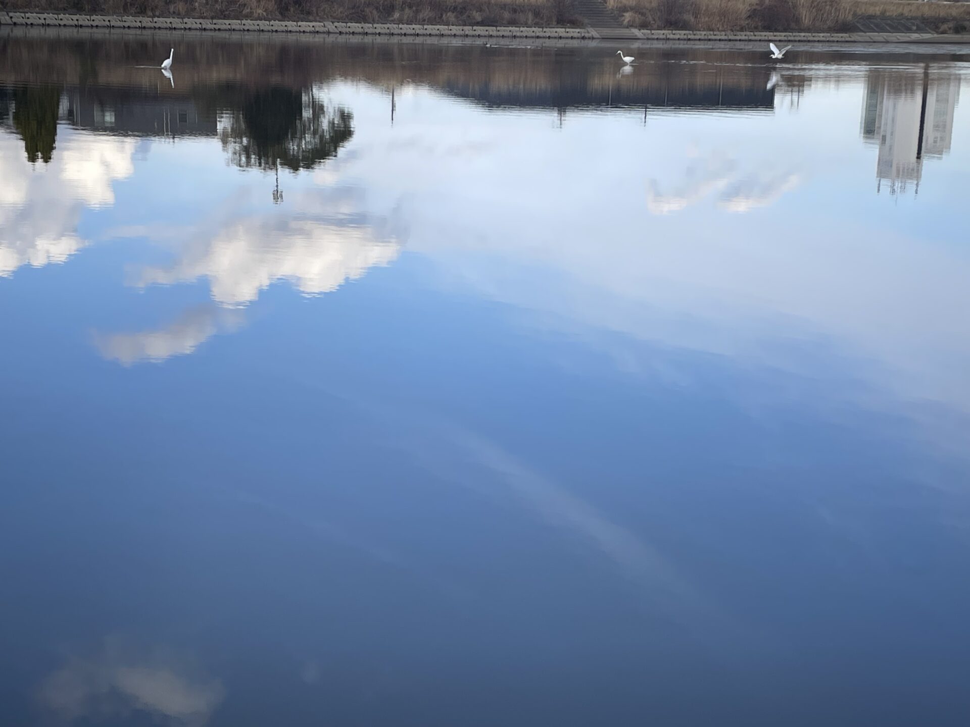 橋の下をのぞくと、水面が空をきれいに映していて、その中に白い影がふわっと見えたんです。光の具合もよくて、なんだか神々しい雰囲気でした。