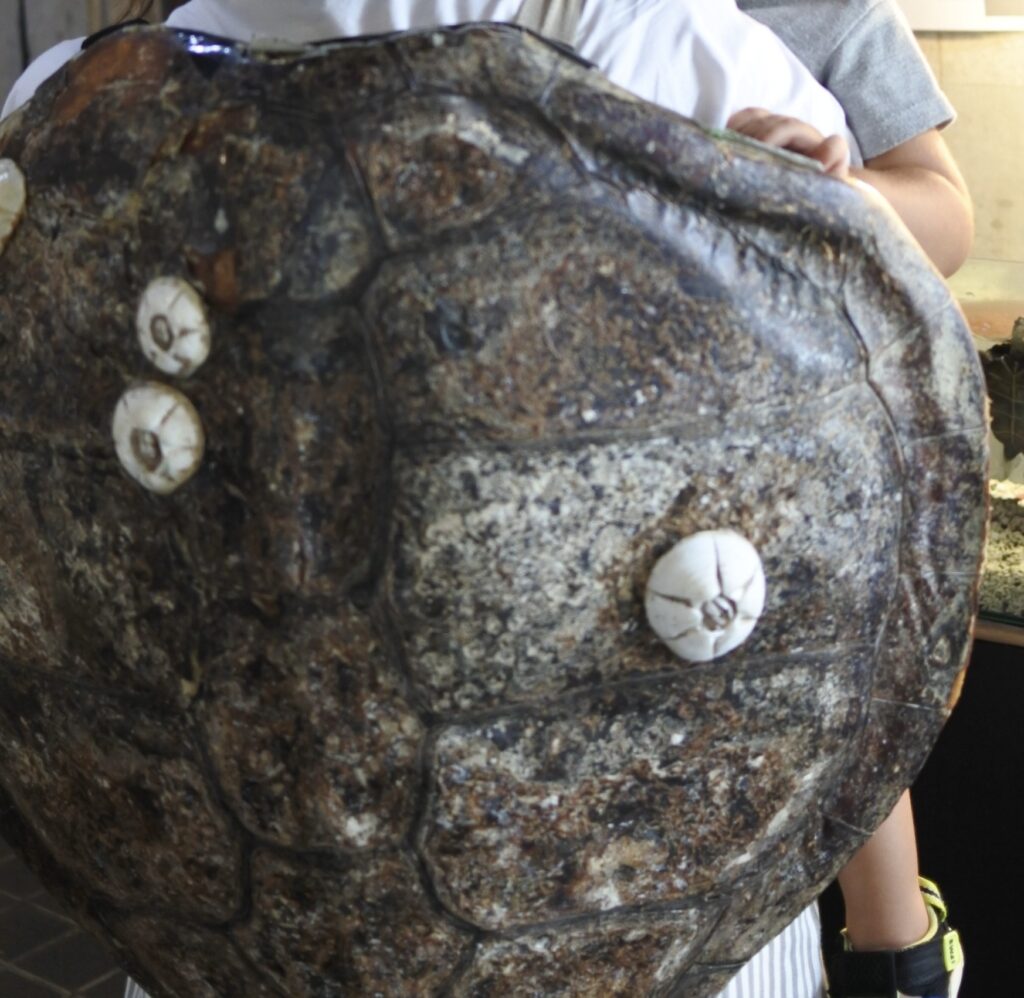 もうひとつ印象に残っているのが、背負えるウミガメの甲羅です。 記念に背負ってみたのですが、ずっしり重い。 そして何より……とても臭かったです。