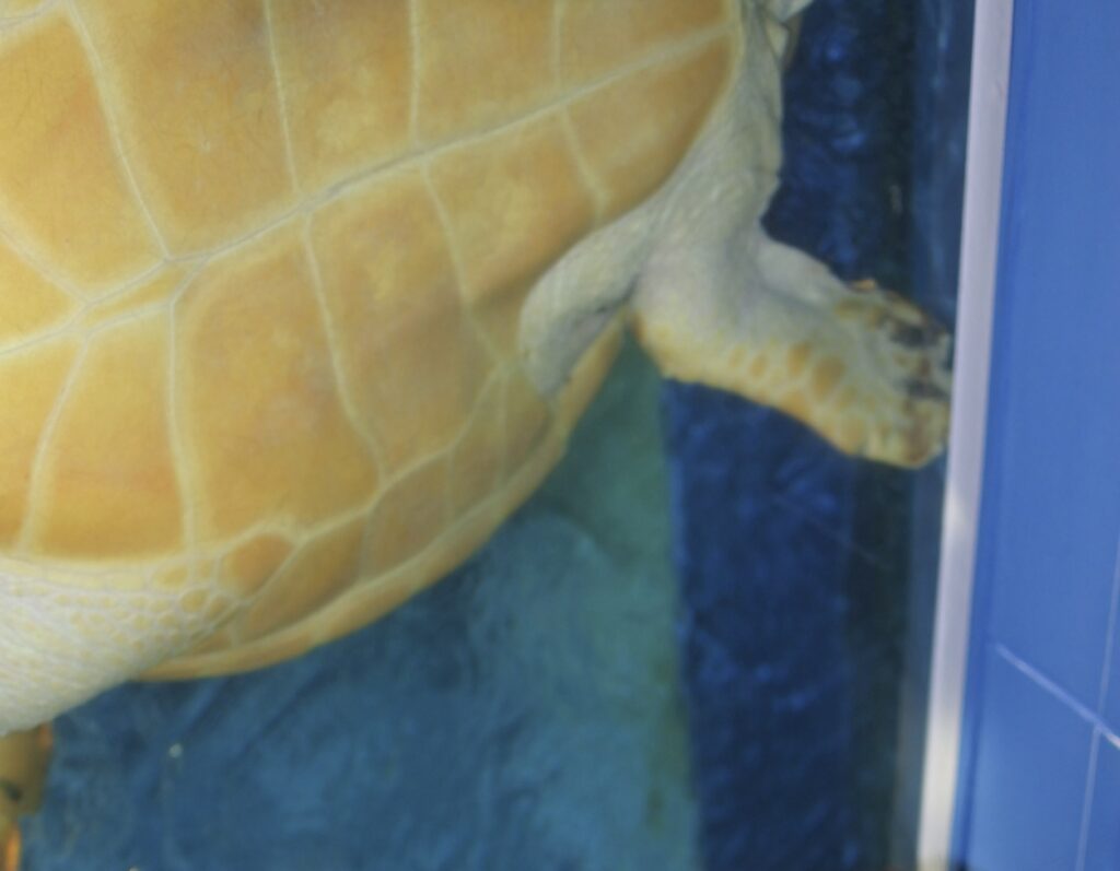 天井を泳ぐウミガメの水槽と、崩壊した画角