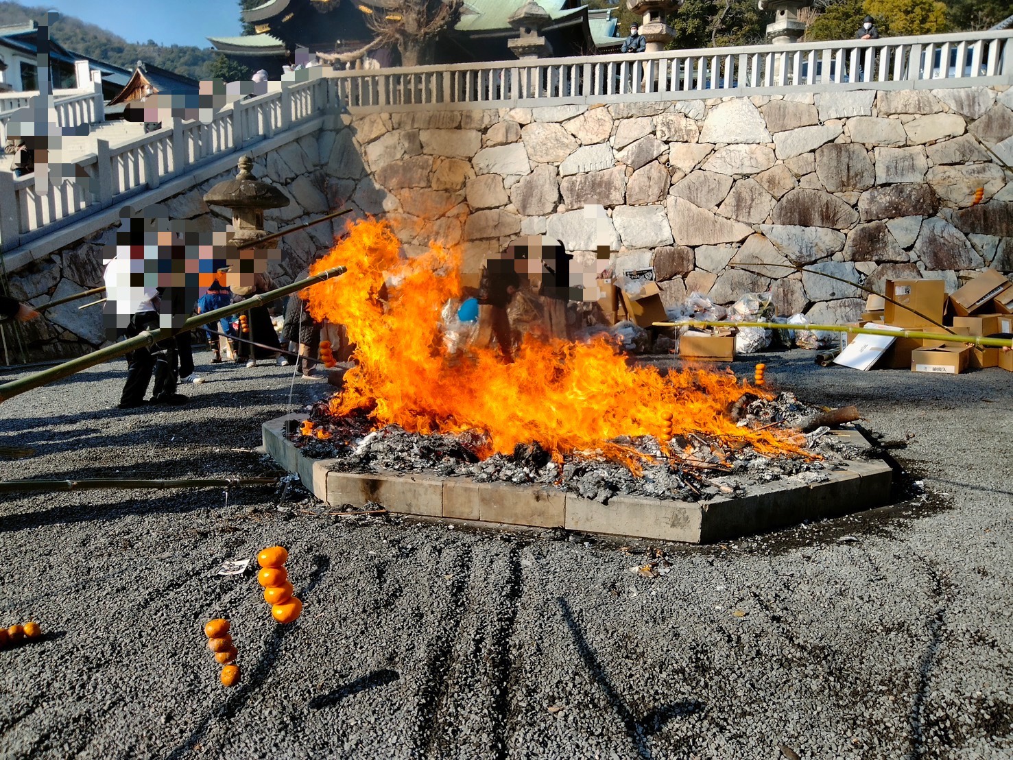 石清尾八幡宮のみかん焼きは、 見た目はどんど焼きに似ていますが、 “みかんを焼いて食べる”のが主役という、少し珍しい行事です。