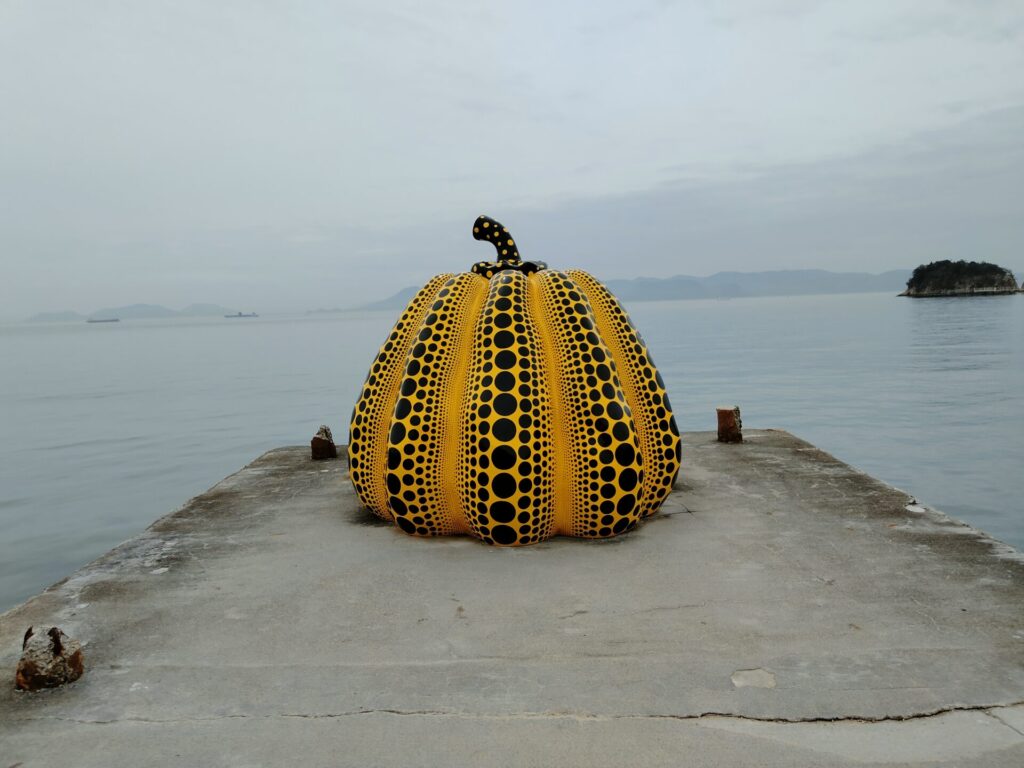 ヴァレーギャラリーからぽちぽち歩いて、ベネッセハウスの芝生で持ってきたパンを食べる。 そのあと、またぽちぽち歩いて黄色いかぼちゃのほうへ。 つつじ荘から出るバスに乗って本村へ移動しました。