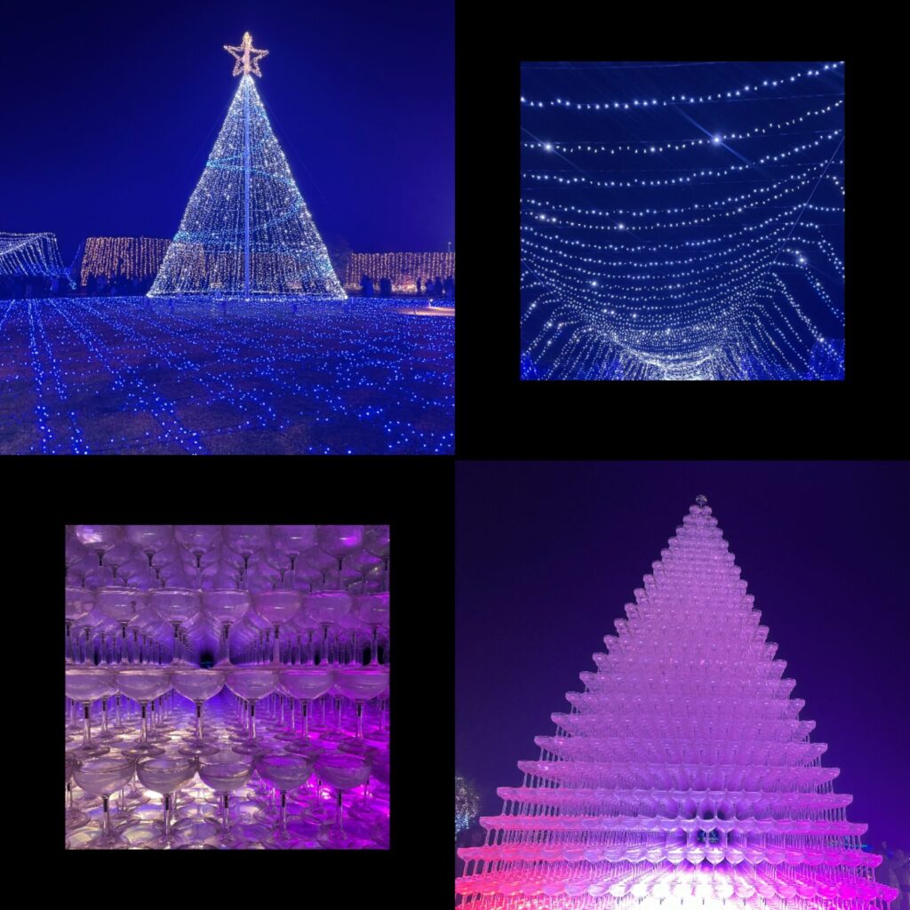 お昼とは違う美しさを見せるグラスツリーとメインのツリー。
