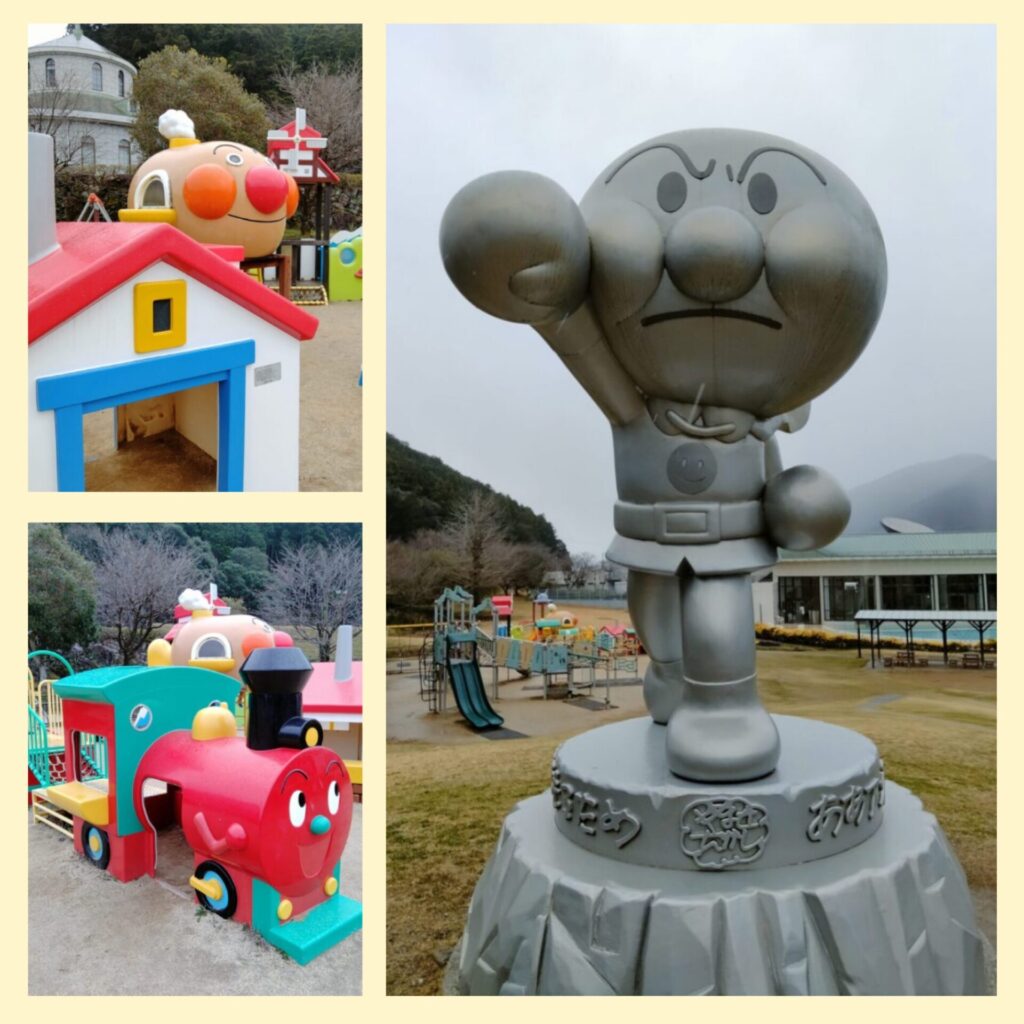 入口を進むと、アンパンマン像の先に広がる屋外遊具エリアへ。