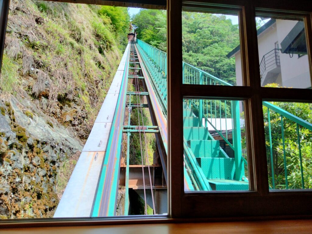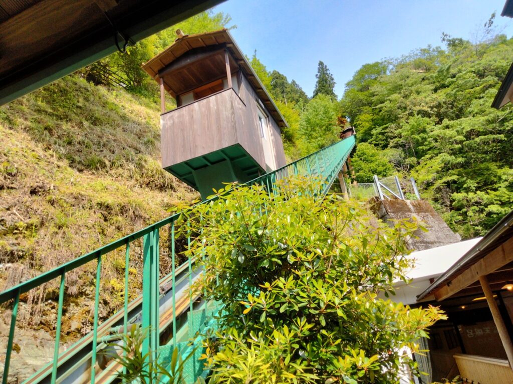 祖谷には、ケーブルカーで温泉に行ける宿が2つあります。 そのうちのひとつが「ホテルかずら橋」。こちらは上りのケーブルカーで露天風呂へ向かうスタイルです(もう一方の「ホテル祖谷温泉」は下りタイプ)。