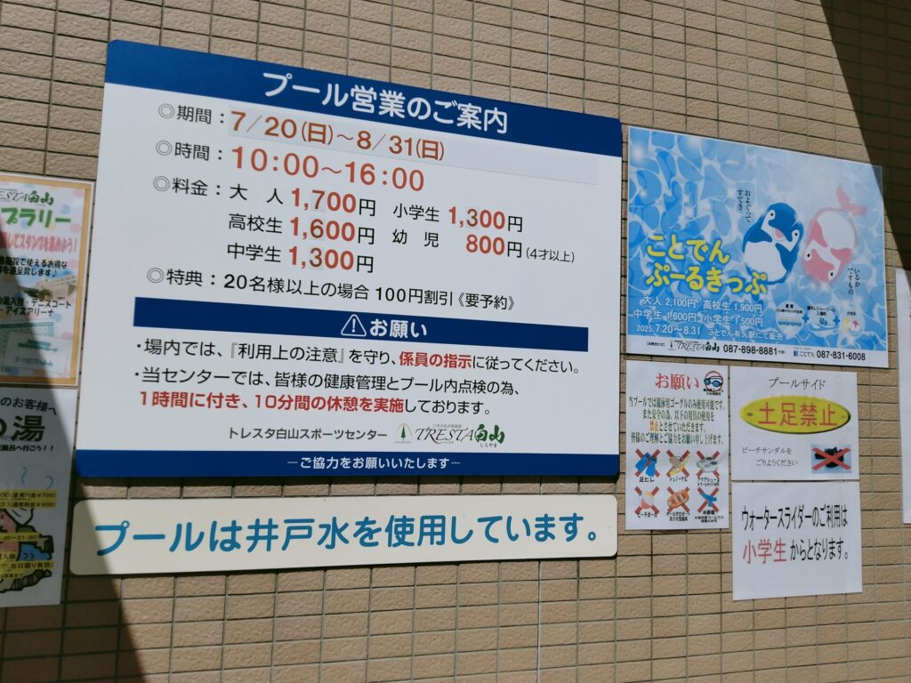 2025年時点では、大人1,700円、高校生1,300円、中学生・小学生1,300円、幼児800円と同規模の善通寺市民プールと比べると高めです。