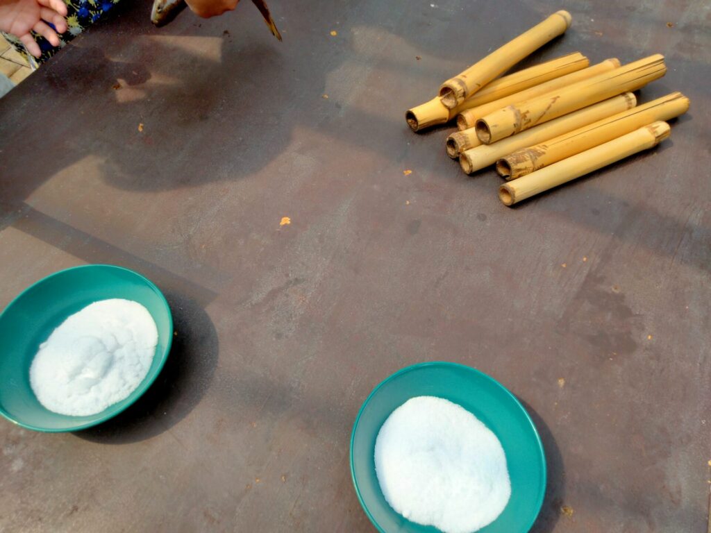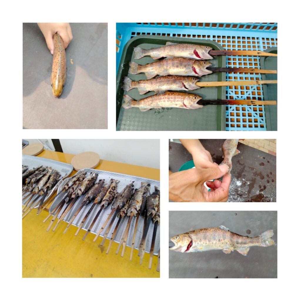 掴んだ後は、締めて串に刺して塩を振る工程があります。棒で脳天部分を叩くんですが、子ども達少しビビり気味。