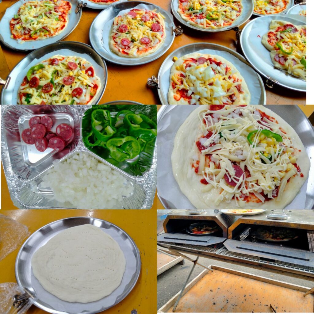 既に作ってくれている生地を伸ばして盛りつけます。こちらも職員さんが焼いてくれるので焼き加減はばっちりです。自分のナンバーが呼ばれたら取りに行くスタイルです。お好みでオリーブオイルやマヨネーズ、ブラックペッパーなどがありました。