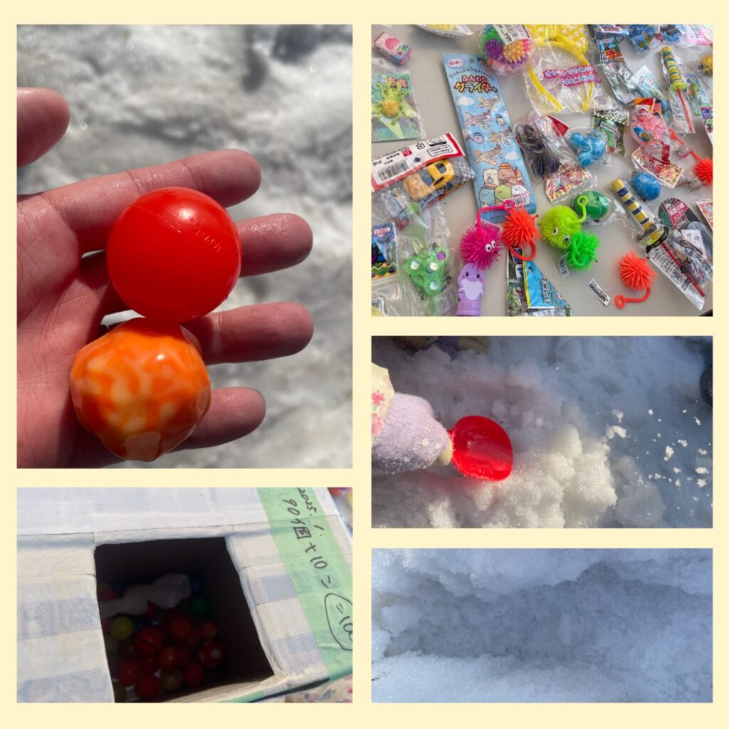 スタートの合図とともに囲いが外れ、子どもたちが一斉に雪へダッシュ。 スーパーボールを見つけると景品と交換してもらえる仕組みです。