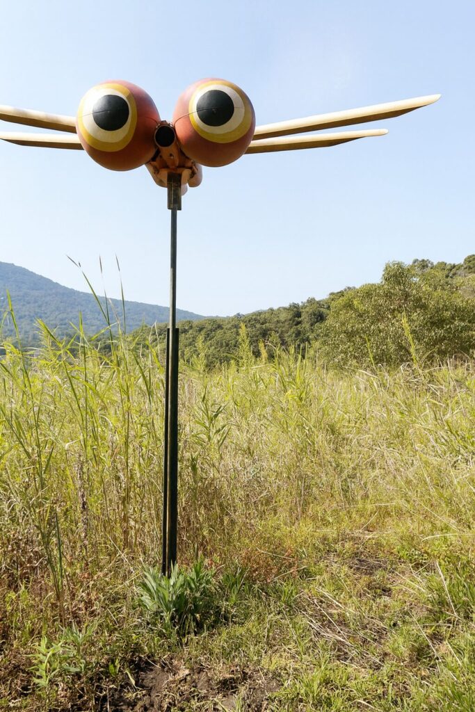 帰り際には、ぜひトンボのオブジェの前で記念撮影を。 大きな目と長い羽がインパクト抜群で、王越らしい素朴さが感じられます。