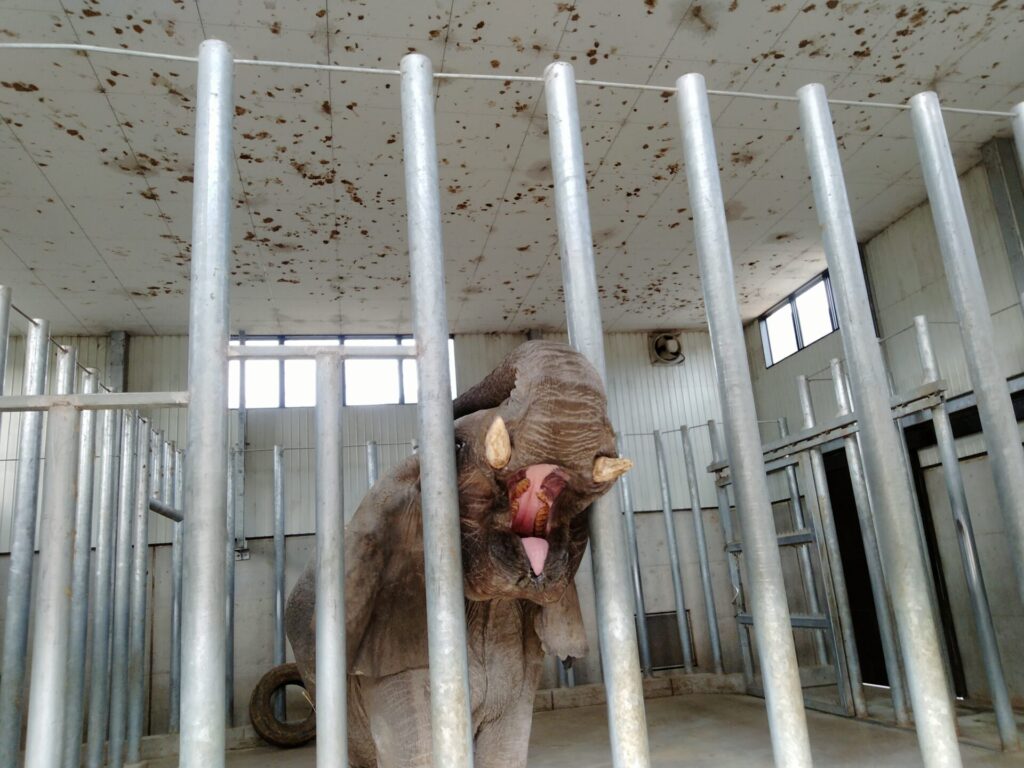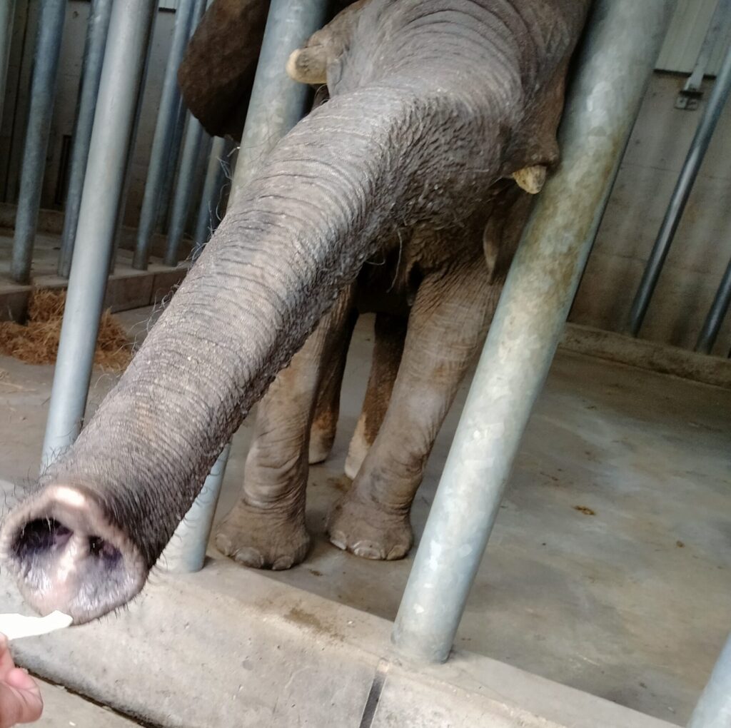 口を開けて待ってくれるので、投げ入れるとキャッチしてくれる。 鼻で取りに来る時は“鼻水セット”が付いてくるのもご愛嬌。