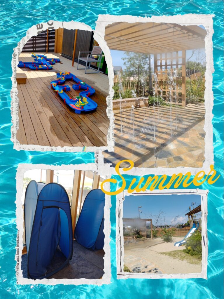 そして外には滑り台、ブランコ、砂場などがあり、夏は噴水が出ます。着替えのテントも用意してくれてますので、水着を持って行くのがベストです。