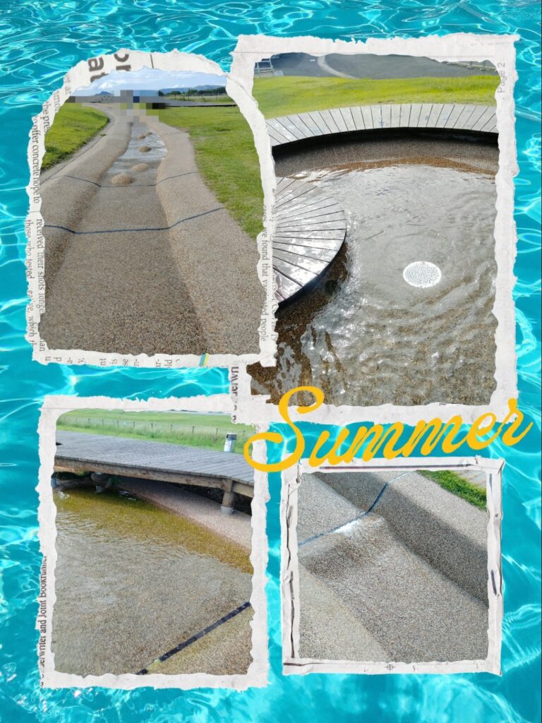 夏場は水が出ていて、上から下に流れていく水路があります。初めの水が出ているところ以外はかなり浅いので、子どもがすごく小さい時から、水遊びに利用させてもらっています。子どもが小学生くらいになれば物足りないかもしませんが、暑くなっても施設内で休憩できるのがいいと思っおり、大きくなってからも度々利用しています。
