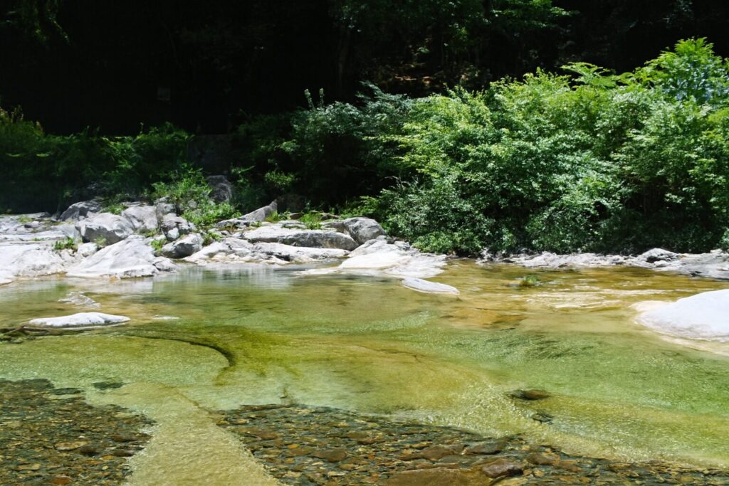 浅瀬は幼児でも安心して遊べる穏やかさで、 奥に進むと深場の青がぐっと濃くなり、ただの川遊びスポットではない雰囲気が漂っていました。