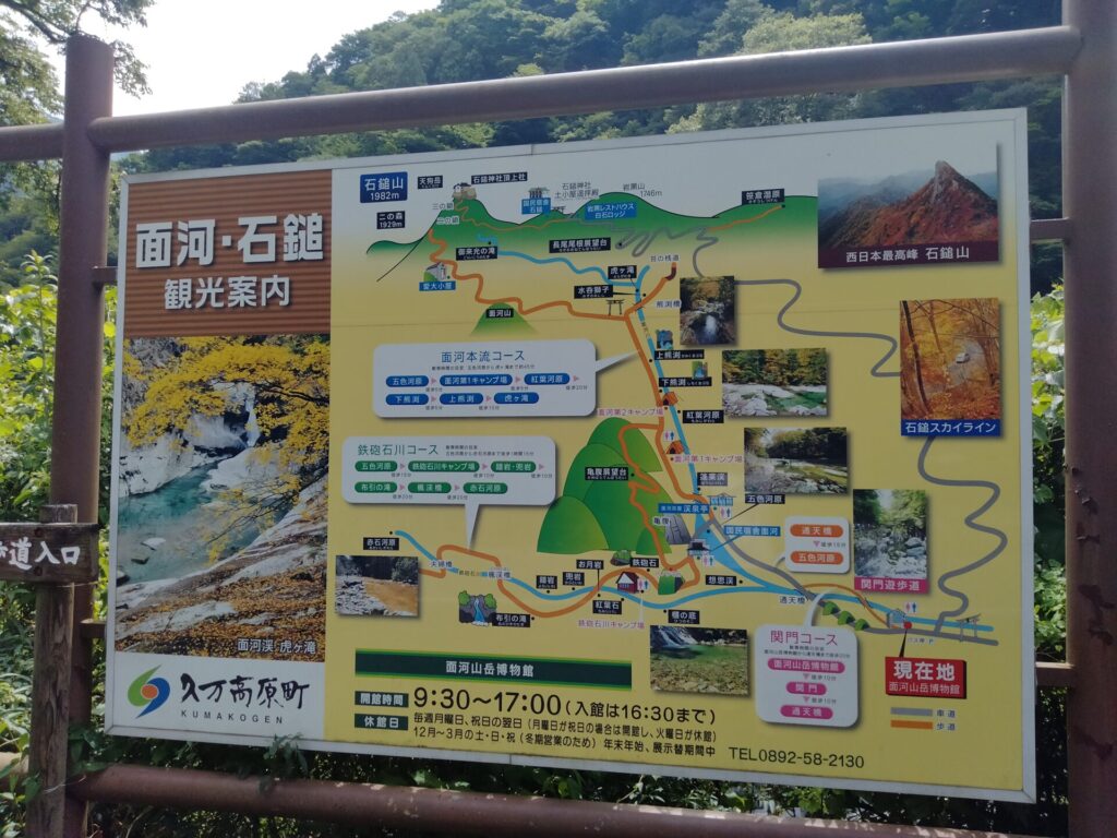 不安のまま辿り着いたのが、面河山岳博物館でした。 とりあえず寄ってみて看板を確認すると、五色河原が一番遊びやすそうだと分かりました。