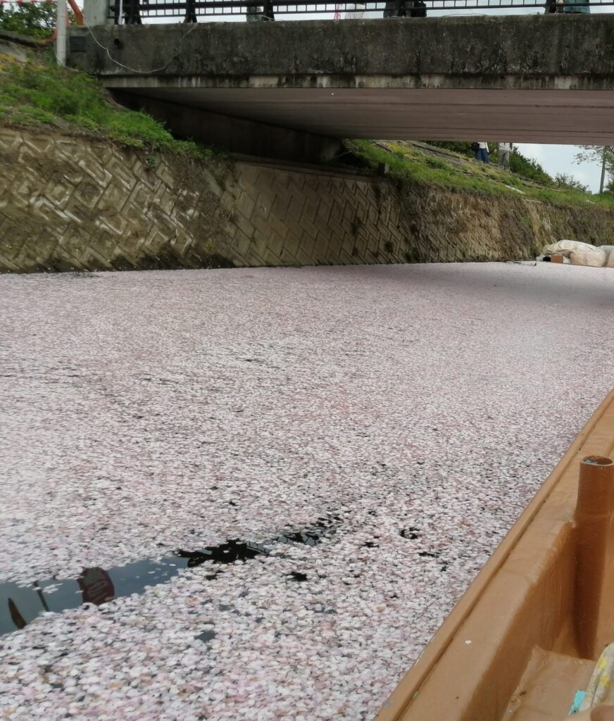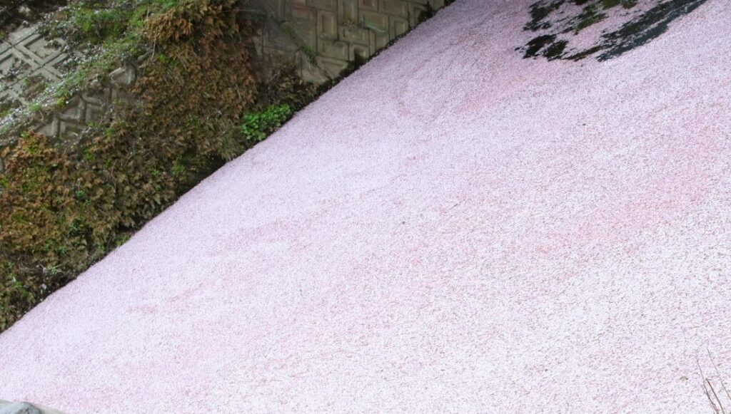 2024年は桜が散るのが早く、3月24日の時点で川一面が桜色。 水面にびっしりと花びらが広がり、まさに“桜の絨毯”でした。