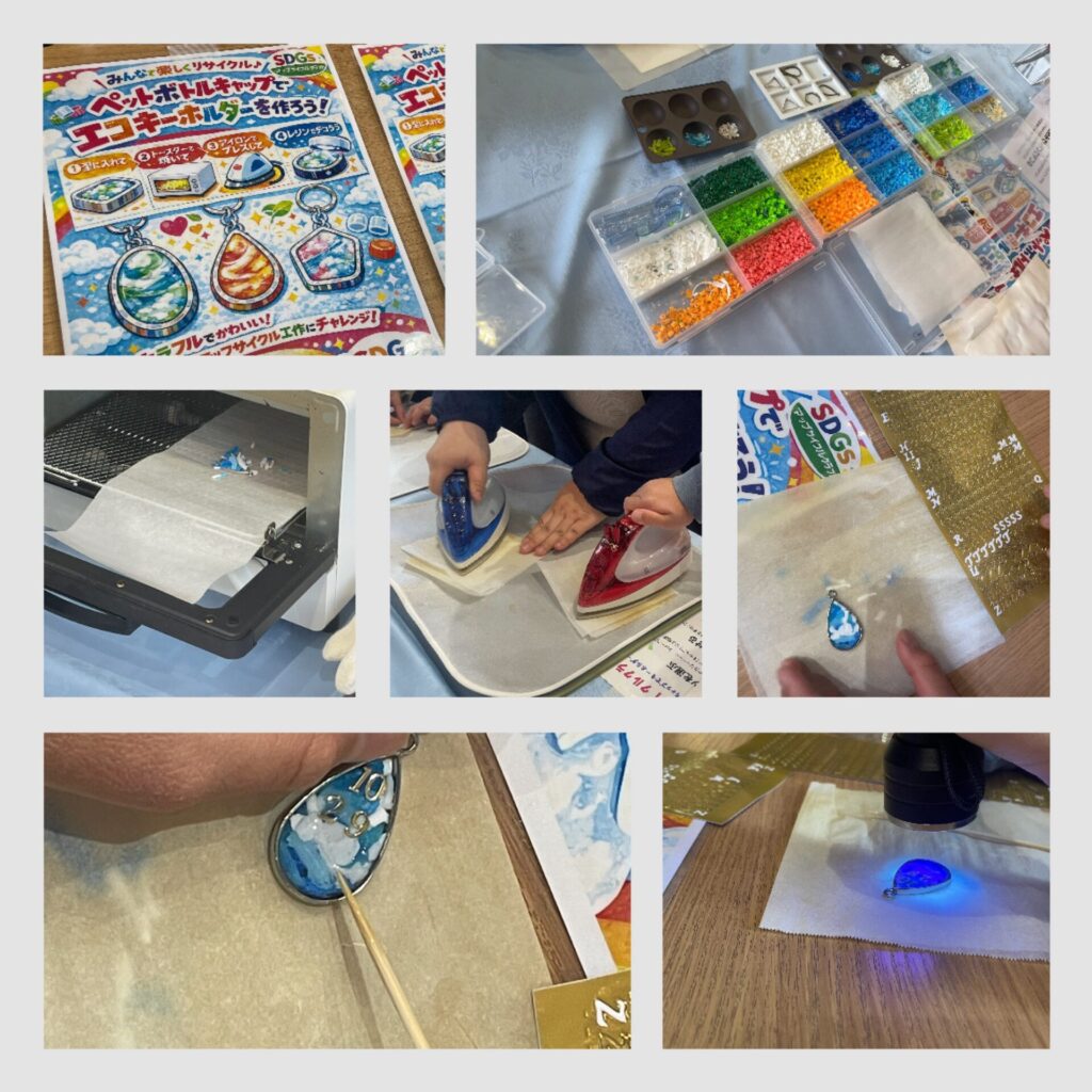① キャップを砕く ② 型に入れてトースターで加熱 ③ アイロンでプレス(両面) ④ シールやビーズで飾り付け ⑤ レジンでコーティングして完成