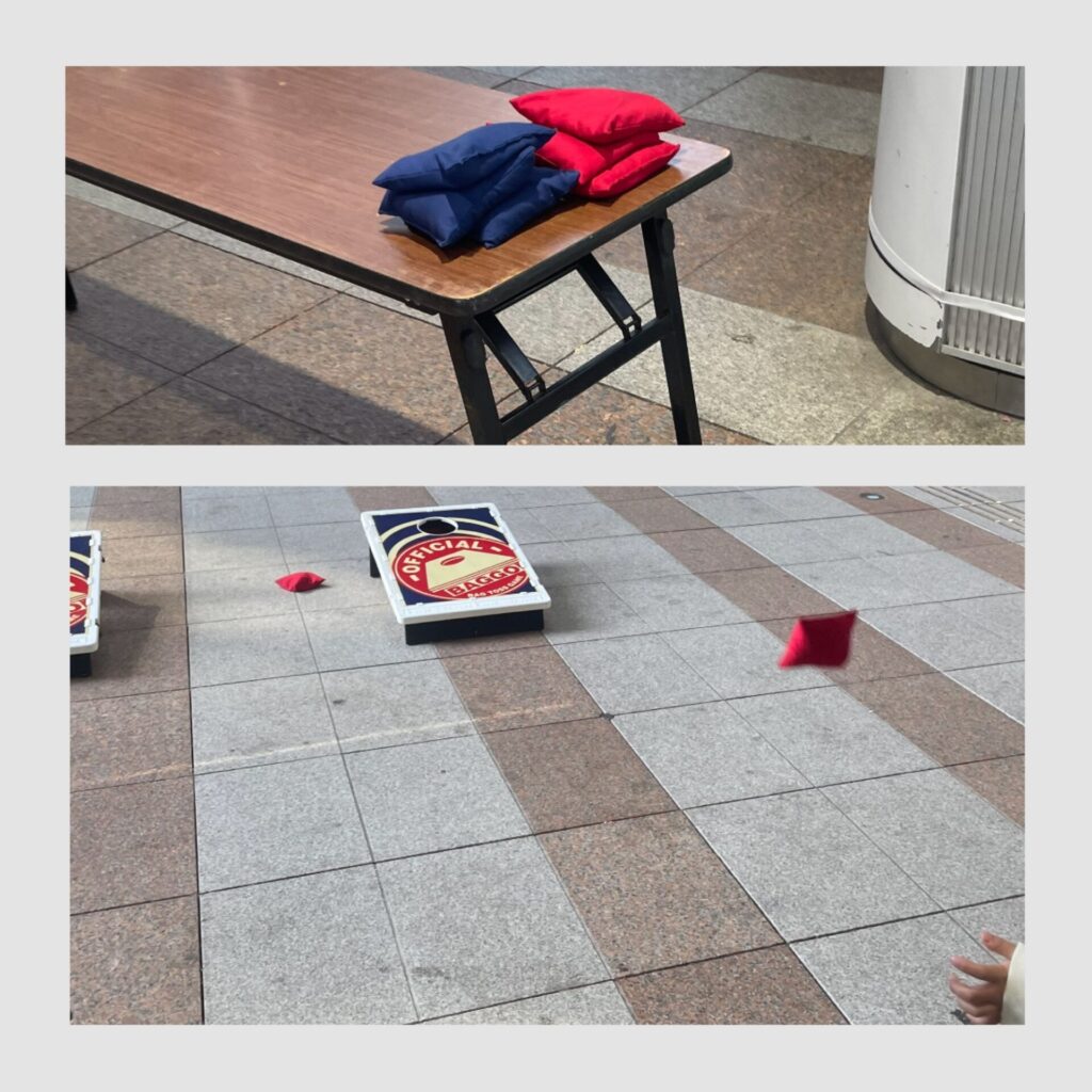 最初は距離感がつかめず、穴に入らない。 でも子どもはボードに乗るだけで大喜びで一番ハマっていました。 大人同士だと「あと1点…!」の駆け引きが熱いです。