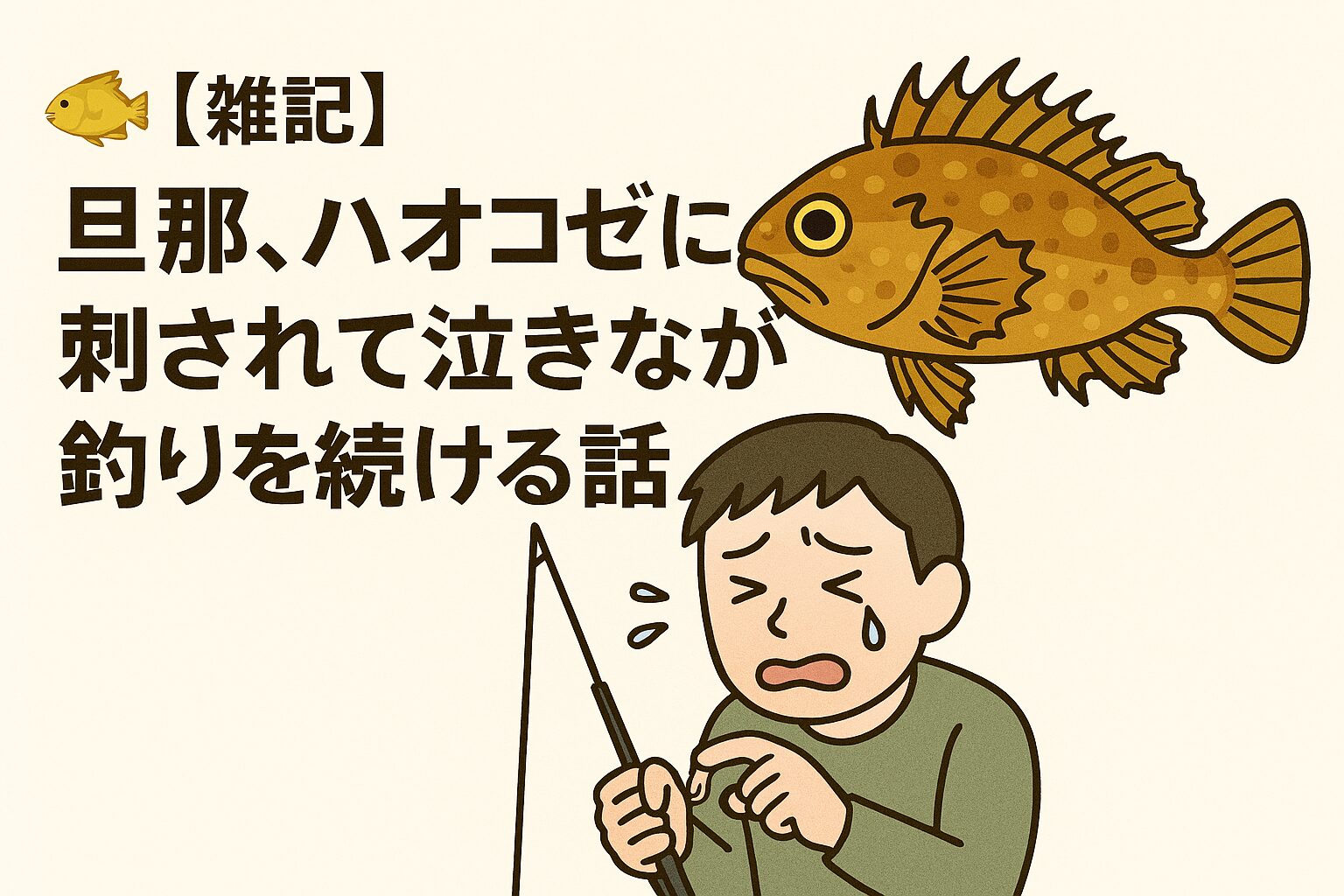 その日、旦那は久しぶりの釣りでテンションMAX。 海に着いて、竿を出して、さあこれから!というタイミングで ちっちゃいハオコゼが釣れたらしい。