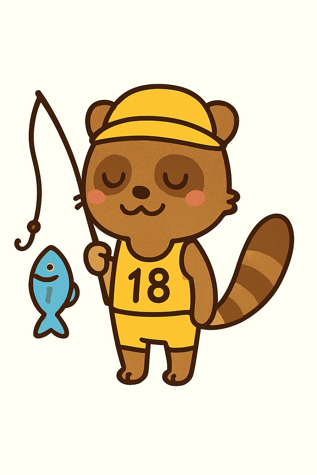 釣り竿とゼッケン7番を背負った、ほんわかたぬきです。