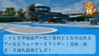 フェリー旅で行く小豆島のふるさと村ファミリープールは、混雑少なめで子連れにぴったり。カエルのスライダーや流しそうめん台も印象的な夏の思い出スポット!