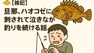 雑記 🐟【雑記】旦那、ハオコゼに刺されて泣きそうになりながら釣りを続ける話 旦那が釣り中にハオコゼに刺されて大ピンチ。痛みに震えながらも帰りたくなくて、まさかの“粘膜ぬりぬり療法”に挑戦した話と、正しい応急処置をやさしくまとめました。ちょっと笑えて、ちょっと可哀想で、ちょっと役に立つ雑記です。 2026.01.20 雑記